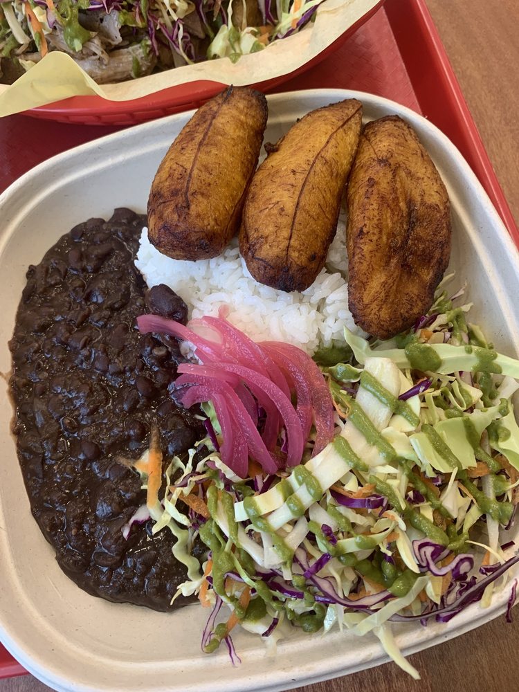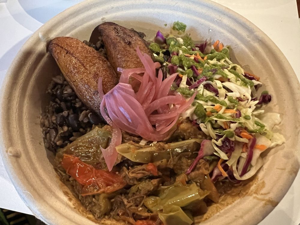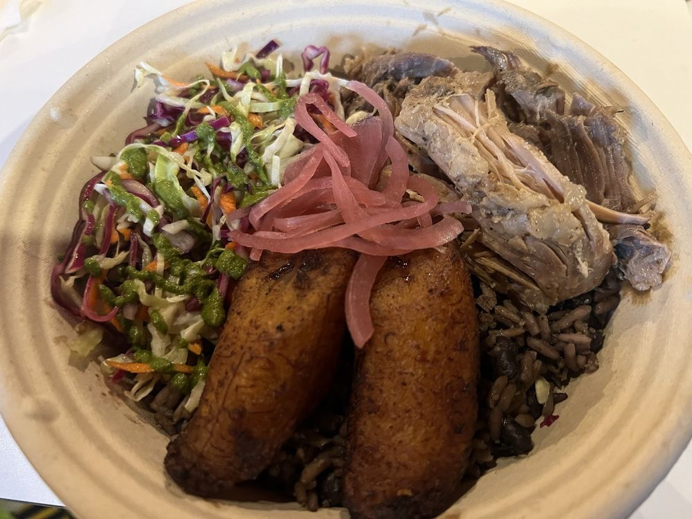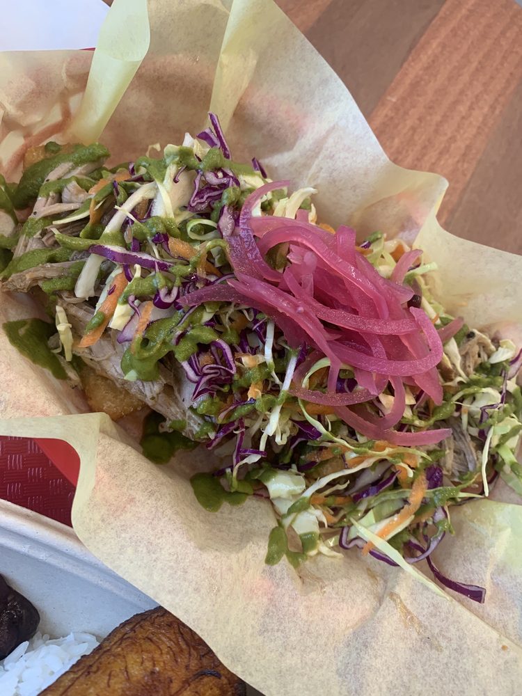 Cassava fries, roasted mojo pork, mint cilantro sauce, guava habanera aioli, tropical slaw and red onion pickles.